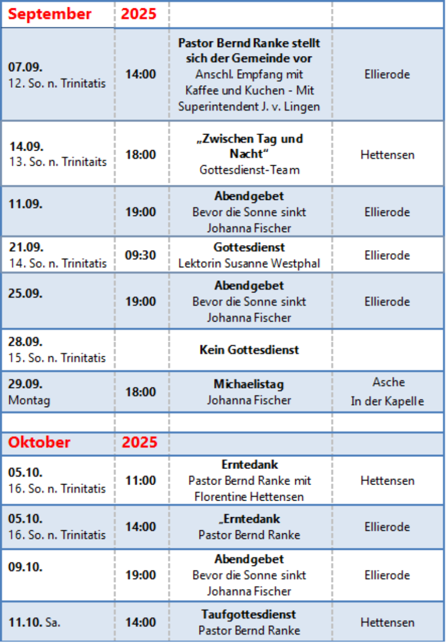 ,Predigtreihe Stolpersteine 2021Die Neuauflage der Predigtreihe „Stolpersteine des Glaubens“ fand aus besagten Hygienevorschriften kontaktlos im Internet statt. Durch anklicken der Zeile startet das Video auf youtube.de: Teil 1:Dr. Martina Steinkühler: “Hauptsache gesund?”Pastor Nicolas Buschatzky: “Ist Gesundheit Aufgabe der Kirche?”Teil 2:Teil 3: Klaus Dettke: “Heilung - Zeichen der Herrschaft Gottes”Teil 4: Christiane Möhle: “Hilft beten?”Predigtreihe Stolpersteine 2022Wer aus Pandemieschutzgedanken den Weg zur Kirche gescheut hat, kann sich trotzdem die Predigten im Nachhinein hier anschauen. Sie werden kurz nach den Gottesdiensten veröffentlicht.Predigt 1: Pastor Nicolas Buschatzky: “Hat es überhaupt Sinn, an die Zukunft der Kirche zu glauben?”Predigt 2: Pastor Hartmut Gericke-Steinkühler: “Kirche ohne Pastor?! - und trotzdem die Kirche im Dorf lassen!Predigt 3: Eine Aufzeichung war aus rechtlichen Gründen leider nicht möglich. Predigt 4: Pastor Bernd Ranke: “Wir brauchen zukünftig mehr Miteinander und Füreinander!””:archiviert:Gottesdienstreiche “Stolpersteine des Glaubens” Thema 2023: “Krieg und Frieden”Manche Fragen können einen zum Stolpern bringen. So ist es auch bei dem Thema „Krieg und Frieden“. Vor dem Hintergrund der aktuellen Situation des Ukraine-Kriegs scheinen alte Glaubensgewissheiten ins Wanken zu kommen. Die Gottesdienstreihe „Stolpersteine des Glaubens“ geht dem nach, was viele Menschen derzeit stolpern lässt.Aus diesem Grund setzt sich ein erster Gottesdienst mit der Beobachtung auseinander, dass die bisherigenGrundsätze christlicher Friedethik durch den Angriffskrieg Russlands in Frage gestellt sind. Wie ein konstruktiver Umgang mit dieser Situation erfolgen kann, wird das Thema der Superintendentin Stephanie von Lingen am 22. Januar in Hettensen sein. Eine Woche später predigt am 29. Januar der Militärpfarrer Michael Fröhlich in Ellierode zur Frage, ob es einen gerechten Krieg geben kann, der unter bestimmten Bedingungen „gottgefällig“ oder moralisch geboten ist. Am darauf folgenden Wochenende ist der Referent für Friedensarbeit aus der Landeskirche Hannovers Felix Paul am 5. Februar in Ellierode zu hören. Er fragt danach, ob der in den letzten Jahrzenten vielfach vertretene Pazifismus einenaive Idee war oder ob er relevanter denn je ist. Den Abschluss der Gottesdienstreihe wird Pastor Martin Possner am 12. Februar in Hettensen vornehmen, welcher Seelsorger im Maßregelvollzug Moringen ist. Er wirf die Frage auf, ob ein nachhaltiger Frieden durch Waffen gesichert werden kann. Alle Gottesdienste beginnen jeweils um 18 Uhr und werden neben Musik von Johanna Fischer durch besondere musikalische Beiträge gestaltet. Zu hören ist etwa der Multi-Instrumentalist Holger Schäfer am 22. Januar, der Fagottspieler Ditmar Wiederhold am 29. Januar und am 12. Februar sowie der Posaunenchor Volpriehausen unter der Leitung von Wolfgang Reuse am 5. Februar. Im Anschluss an die Gottesdienste sind die Besucherinnen und Besucher eingeladen zu Canapés sowie einem Glas Wein und anderen Getränken, um miteinander ins Gespräch über das Gehörte zu kommen. (Quelle: Leine-Solling-Pressedienst)Gottesdienste: